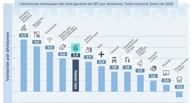 Las dos divisiones que registraron las menores variaciones en enero de 2026 fueron Educación (0,6%) y Prendas de vestir y calzado (-0,5%).